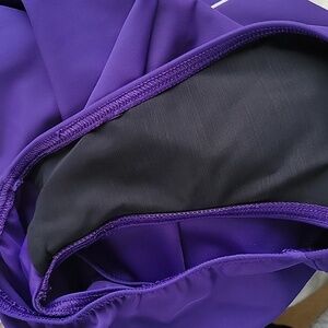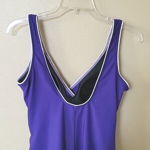 EUC Miraclesuit womens purple Horizon slimming one piece swimsuit with white flattering stripes. Does not have hygenic liner