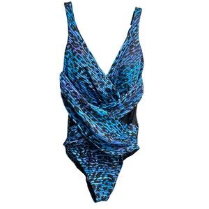 Miraclesuit Purr Fection Crossover One Piece Swimsuit Sz Small Blue Mesh Cutout