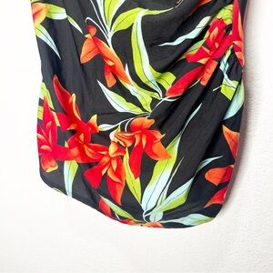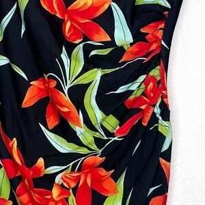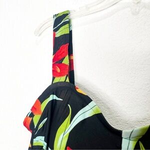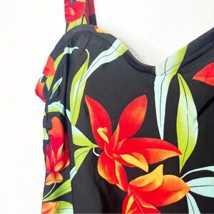 Older style. Skirted bottom. Gentle sweetheart neckline. Thicker straps. Low back. Side draping/ruching. Classic oversized floral Hawaiian inspired print.