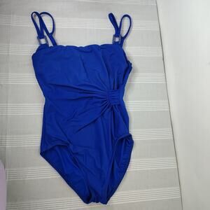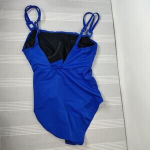 Miraclesuit Swim Bathing Suit Women's Size 10, Royal Blue. Rectangular acrylic strap feature with metallic silver detail. Black bralette has underwire support. Silver colored metal adjustable straps. Ruching to the side under the left breast for extra slimming look. Preowned excellent condition. From a non-smoking home.