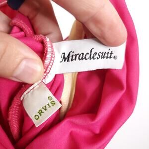 The Miraclesuit Swim Top in Women's size Large is a stylish and slimming tankini in a bright pink color. Made of nylon material, this one-piece top features ruched detailing and a knotted design, perfect for a flattering beach look. The spaghetti strap adds a touch of elegance to this solid color top, making it a trendy choice for your next beach outing or poolside relaxation. With its slimming features and high-quality brand, this tankini is sure to make you feel confident and chic in the water.