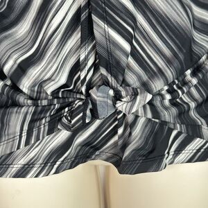 * Features a distinctive black and white abstract stripe pattern with a contrasting printed trim at the neckline.