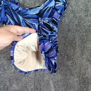 This blue tank top features a ruched design that offers a flattering, fitted silhouette. The sleeveless style is perfect for warm weather, while the vibrant blue color adds a touch of elegance to any outfit. Ideal for casual outings or a stylish day out. Miraclesuit tankini top rushed for slimmer waist..has underwire it's in good condition...Has been washed n air dry..