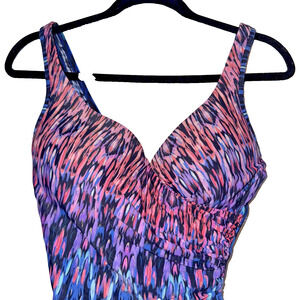 Stunning Miraclesuit Vesuvio "It's A Wrap" one-piece swimsuit in vibrant blue-to-purple ombre print. Features signature tummy control technology, underwire support, and flattering V-neckline with wrap detail. Bright colors make this one-piece swimsuit by Miraclesuit® an eye-catching piece with an elegant V-neck for a bold look. Perfect for confident poolside style with slimming silhouette enhancement.