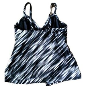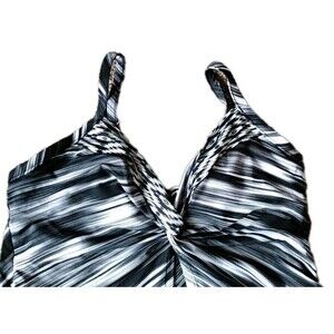 Miraclesuit Warp Speed Love Knot Tankini Swim Top Size 10 Black White Mix Print Underwired For Extra Support and Lift Split Front Excellent Pre-owned Condition