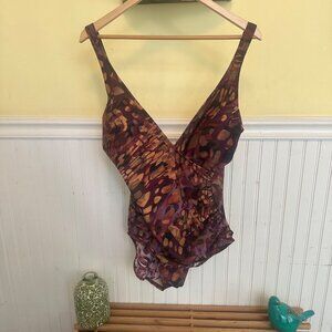 Miraclesuit Womens Purple Abstract Print Swimsuit V-Neckline Ruched Size 16