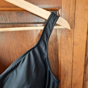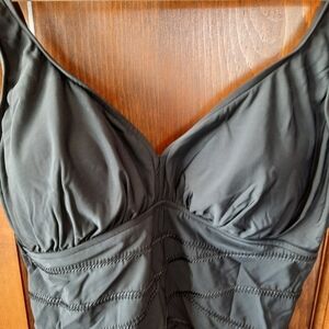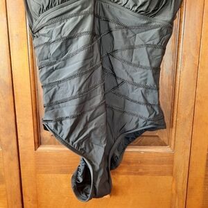 Miraclesuit black slimming swimsuit style 470705. Padded cups, slimming criss-cross design, round scoop back, and full coverage bottom. Size 16.