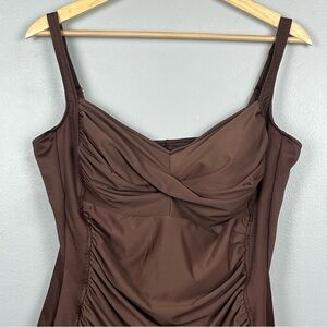 Miraclesuit brown 1 piece modest ruched slimming swimsuit, size 16.