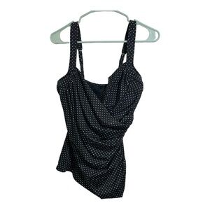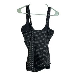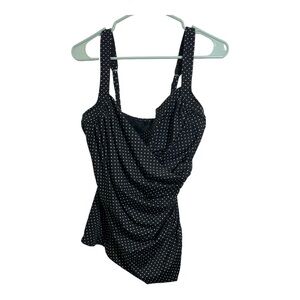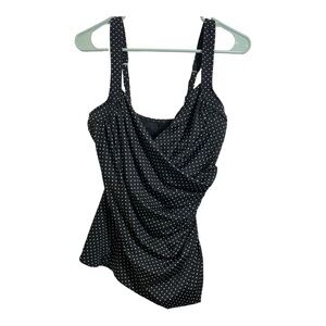 Miraclesuit tankini top. Black and white polk dots. Built in bra adjustable straps. Fits medium size is not visible.