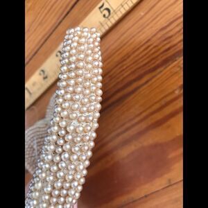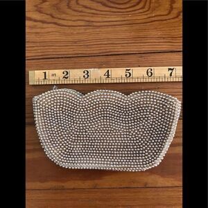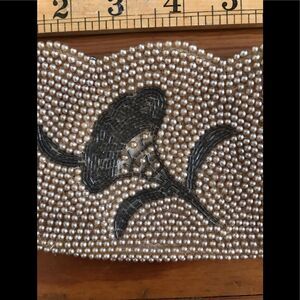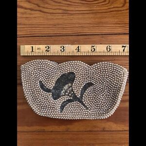 Very lightly used. Gold beading with floral pattern on front. I searched, and there is one slight flaw (pictured). Though it looks like a small hole it is not - it is a very small tear (hardly noticeable). Good condition in inside (no stains, etc). Scalloped trim. Made in Japan.