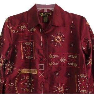 Mirasol Silk Embroidered Blouse Womens Size S VTG Burgundy Boho Embellished