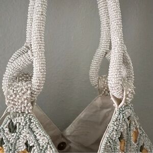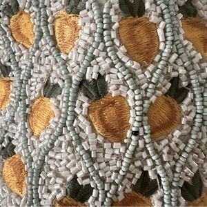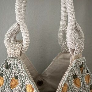 Stylish hand beaded white bag with embroidered lemon pattern. Sweet, whimsical and practical with inside pocket and magnetic snap closure.