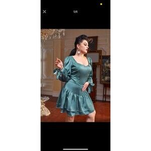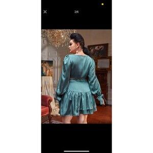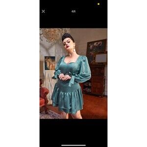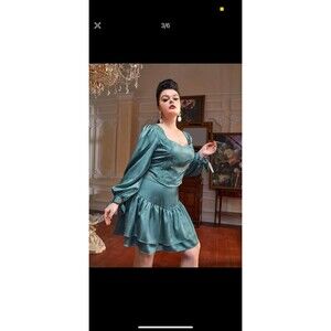 Includes top and skirt. Nice thick and heavy good quality material. Satin feeling. Green Blue color. Embroidered floral detail. Sweetheart neckline. Puffy sleeves that tie at wrists. Layered skirt that is fitted and then flares.
