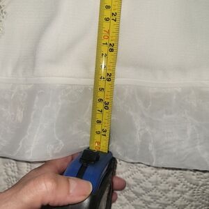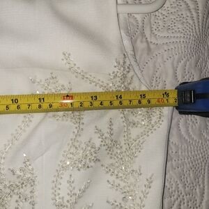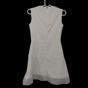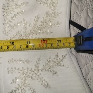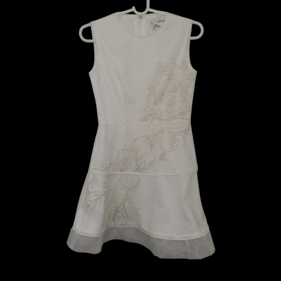 This stunning white sheath mini dress by Miri Couture is perfect for cocktail parties, reczption dress, bridal shower or rehearsal dinner dress. Featuring a sleeveless design with a classic crew neck, it offers a chic and sophisticated look. Size wore off the tag but measurements are pictured. Fits a size small. Original price $900