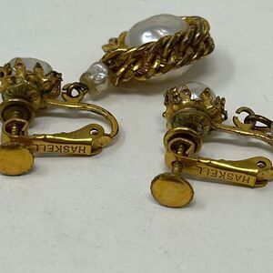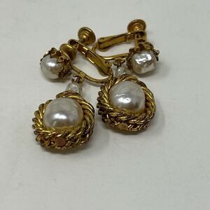 Miriam Haskell, Dangle Baroque pearl, gold tone clip on earrings.