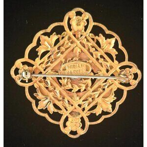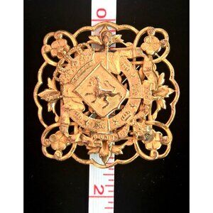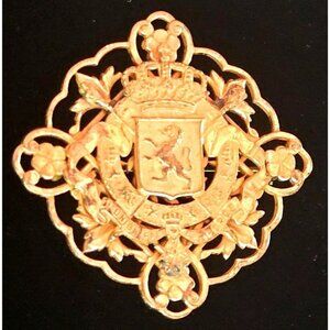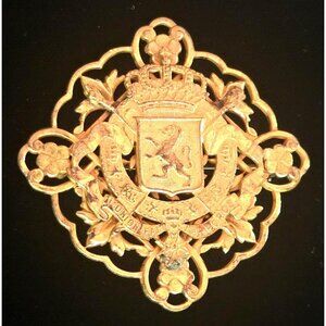 Miriam Haskell Gold-Tone Vintage Brooch With Intricate Floral & Lion Crest Desig