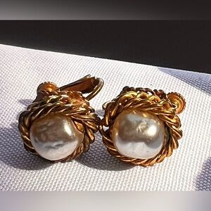 Classic Miriam Haskell faux pearl earrings in a goldtone setting.. these mimic the design of the chanel earrings but miriam haskell was a more sought after. It is said coco chanel copied aome haskell designs