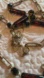 Unusual dark beads : amber color with a dark black pattern within the beads. Both round faceted beads and barrel shaped beads.