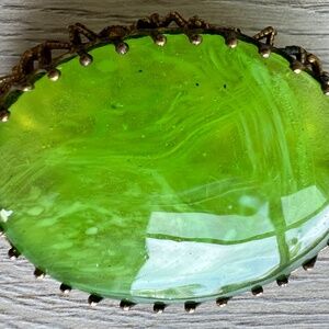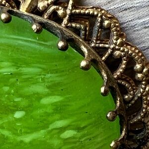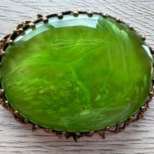 A stunning , signed, vintage statement brooch from iconic costume jewelry designer Miriam Haskell. This large 2-inch oval piece features a luminous swirled marbelized green art glass cabochon, set in Haskell’s signature intricate antiqued gold-tone filigree. The marbled pattern within the glass evokes the look of jade or seafoam, adding depth, elegance, and a hint of drama.