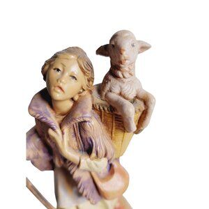 This charming Miriam Fontanini nativity figurine captures the innocence and serenity of a young shepherdess, accompanied by a lamb nestled in a woven basket. The intricate details and soft hues reflect a timeless Christmas scene. Ideal for collectors, this piece embodies the delicate craftsmanship and storytelling of classic Italian artistry.