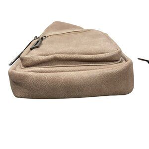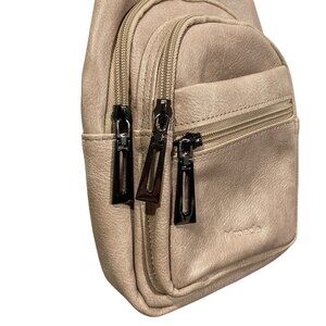 This Miroeda sling backpack is crafted from beige faux leather, offering a stylish and functional design. With multiple zippered compartments and an adjustable strap, it provides convenience for carrying essentials. Perfect for daily use, its compact size and versatile style complement various outfits and occasions.