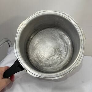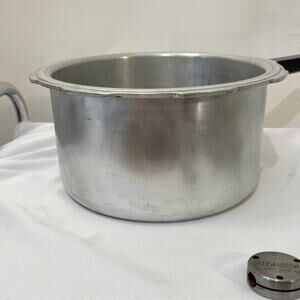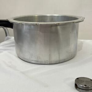 Mirro Matic Aluminum Pressure Cooker 394M 4 Quart Complete with Rack & Jiggler Weight. Gasket is in great condition, tight seal. Cooker is in good working order, however it does have some stains, scratches and discoloration consistent with vintage age.