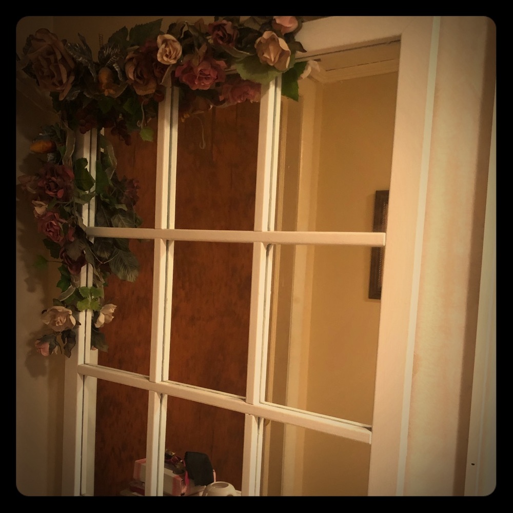 Beautiful mirror with boxes and flowers.