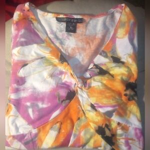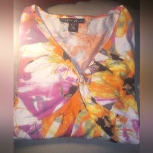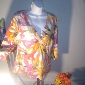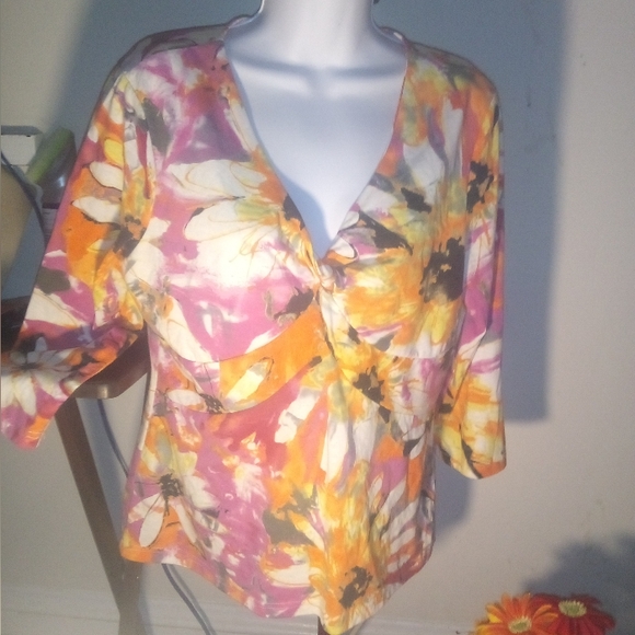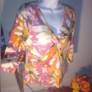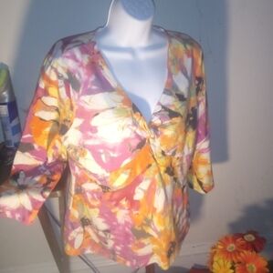 Description: Womens 3/4 sleeve floral blouse, decorative accent v- neckline pullover