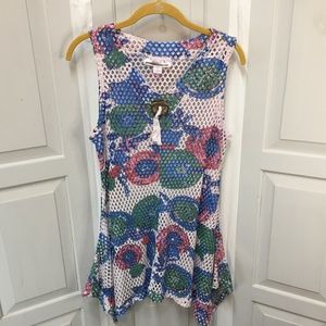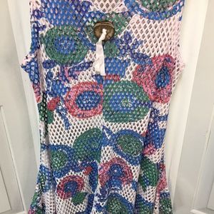 Mirror Image stretchy netted (perforated) coverup with circle pattern and decorative button at mid-neckline. Hemline is longer on sides.