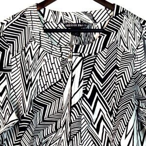This striking jacket from Mirror Image features a bold black and white geometric print that effortlessly commands attention. Crafted from a soft linen-cotton blend, it offers both comfort and style. The zip front design allows for versatile styling options, making it suitable for layering over various outfits. With its unique pattern, this jacket is a stylish choice for those looking to make a statement with their wardrobe.