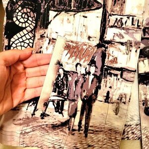 Mirror Image Paris Womens Jean Jacket M Eiffel Tower Print Lightweight -Khaki w/pockets , 3/4 sleeves
