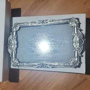 mirror new in box and packaging unused. mirror portion not including the silver portion is approx 9x 5.9 inches. opened for taking pictures only