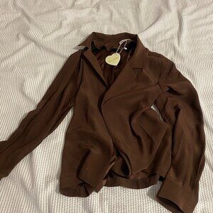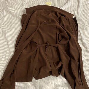This is a silk brown button up top with a tie in the back to sinch the waist. Never been worn before with tags. Size XS.