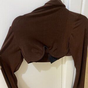 This is a brown underwire turtleneck mirror palais crop top. It is a size XS. Worn a few times but in great condition.