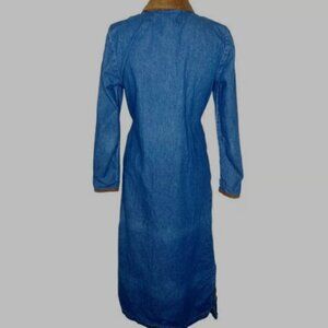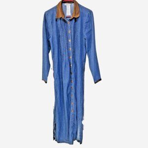 Vintage Mirrors 2 Maxi Denim Dress W/Brown contrasting collar & cuffs. Beautiful buttons adorn full length of dress. Also has attached matching denim tie/belt to cinch the waist and create a flattering silhouetteand. Both sides have slits. The dress is 100% Cotton & the contrasting trim is 100% Polyester. Machine washable.