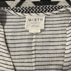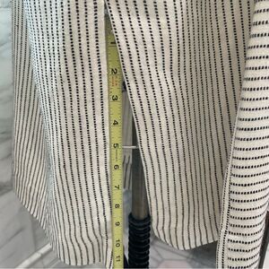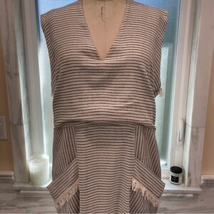 Mirth Biarritz 100% cotton ivory/black striped dress. Fully lined, two front patch pockets with fringe strip, small fringe strip on back, side zip, sleeveless, two side slits, V-neck, Sz-L. Can be worn straight or belted. Beautiful dress! Great condition 😊