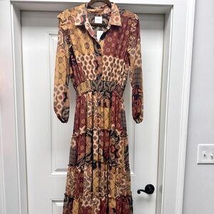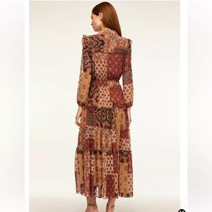 Our universally flattering Ahreana is back for fall in a Surreal Patchwork printed chiffon in the perfect fall palette. This feminine take on the shirt dress features a covered front button placket to the elasticated waist. A fold collar and delicate ruffle shoulder details lead into long semi-sheer sleeves. Back placket ruffle detail. The bodice and skirt are self-lined. The tiered ankle-grazing skirt finishes off this timeless style that can be worn with everything from boots to strappy heels.