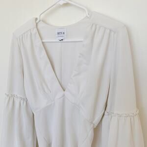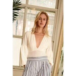 White Bodysuit with puff sleeves. Haany Deep V Neckline Bell Sleeve Ruffle Bodysuit Blouse in Cream. Perfect to pair with jeans or a cute skirt!