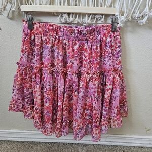 Evoke effortless chic ease in this skirt by MISA Los Angeles this season. Crafted from pink floral chiffon this mini skirt features delicate ruffle detaling with an elasticated waistband for a comfortable fit and feel and is finished with a decorative ruffle hemline.