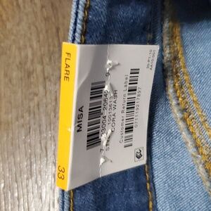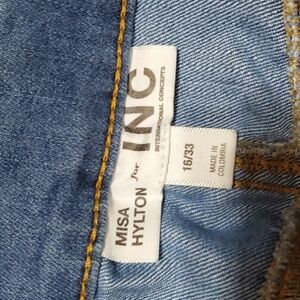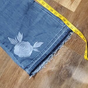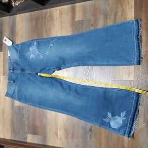 new with tags no issues high waisted embroidered floral on denim jeans raw fringe cuff on flare leg size 16/ 33 by Misa Hylton for INC