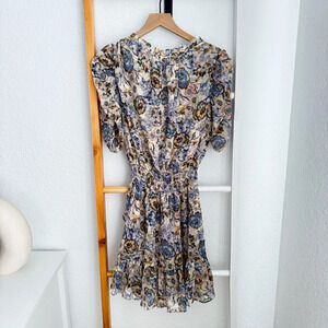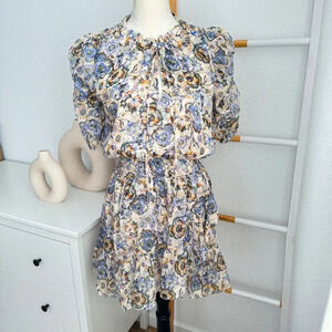 Misa Las Angles Kayla Mini Dress Sketched Floral Smocked Tie Neck