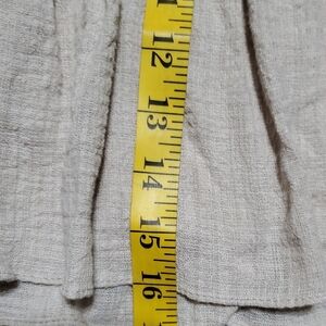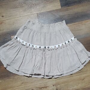 This cream and tan mini skirt by Misa Los Angeles is perfect for casual or resort wear, featuring playful ruffles and delicate embellishments. The elasticized waistband offers a comfortable fit, while the layered design adds a touch of elegance to your ensemble.