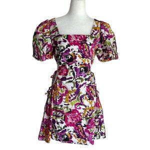 A feminine mini made to turn heads, the Alec is handcrafted from a floral cotton poplin fabrication. Featuring a square neckline and short puff sleeves with elastic cuffs. Side cutouts through the waist with adjustable string ties reflects a confident look. This standout style is an easy addition to your Summer wardrobe.