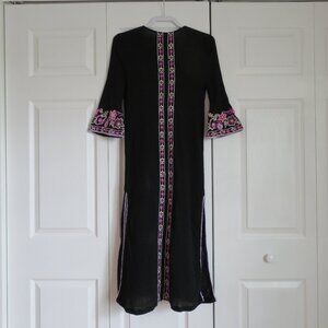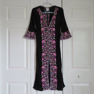 This hand-embroidered caftan from Misa Los Angeles is prefect for beach, festival, or resort wear. Semi-sheer black crinkle cotton fabric, embroidered on front and back with a pink and white floral pattern. Pullover style. Front and side slits allow for ease of movement. 3/4 length sleeves with a slight flare. 100% cotton. Size XS. Made in India.