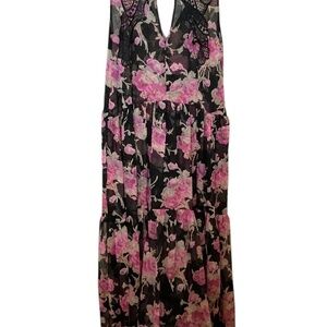Elegant maxi dress with floral pattern. Features black lace Butterfly details. Sleeveless design with a flowing silhouette.