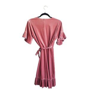 Effortlessly chic, this mini dress is perfect for evening outings or festive occasions. Exudes romantic charm with its wrap front design, secured by a braided tie closure that cinches the waist perfectly. Crafted from soft, textured velvet, it features delicate ruffle trim that adds movement and a playful touch.