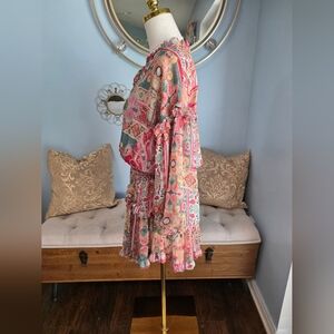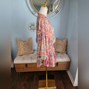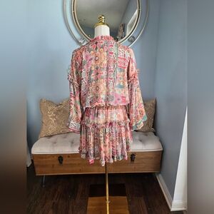 This tiered scarf print mini by MISA Los Angeles is the epitome of boho chic. Features a mix of pink, green, and cream colors. Flowy sleeves and ruffled skirt add elegance.