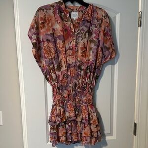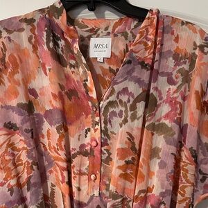 Chic floral blouse by Misa Los Angeles. Features pink and purple hues. Lightweight and stylish. Perfect for any occasion.