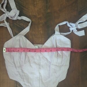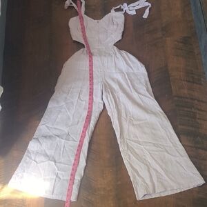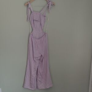 Chic lavender sleeveless jumpsuit with tie straps. Perfect for a stylish look.