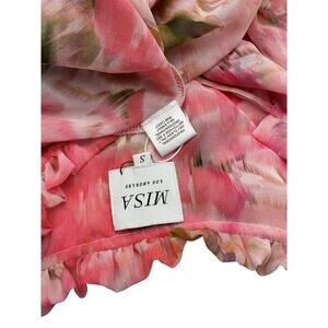 Misa Los Angeles 'Lilian' Pink Viscose Dress Size S: partially lined, pull-on styling, smocked waistband, split neckline with tie closure, lightweight fabric, measurements: 18 inch bust x 34 inch length.
